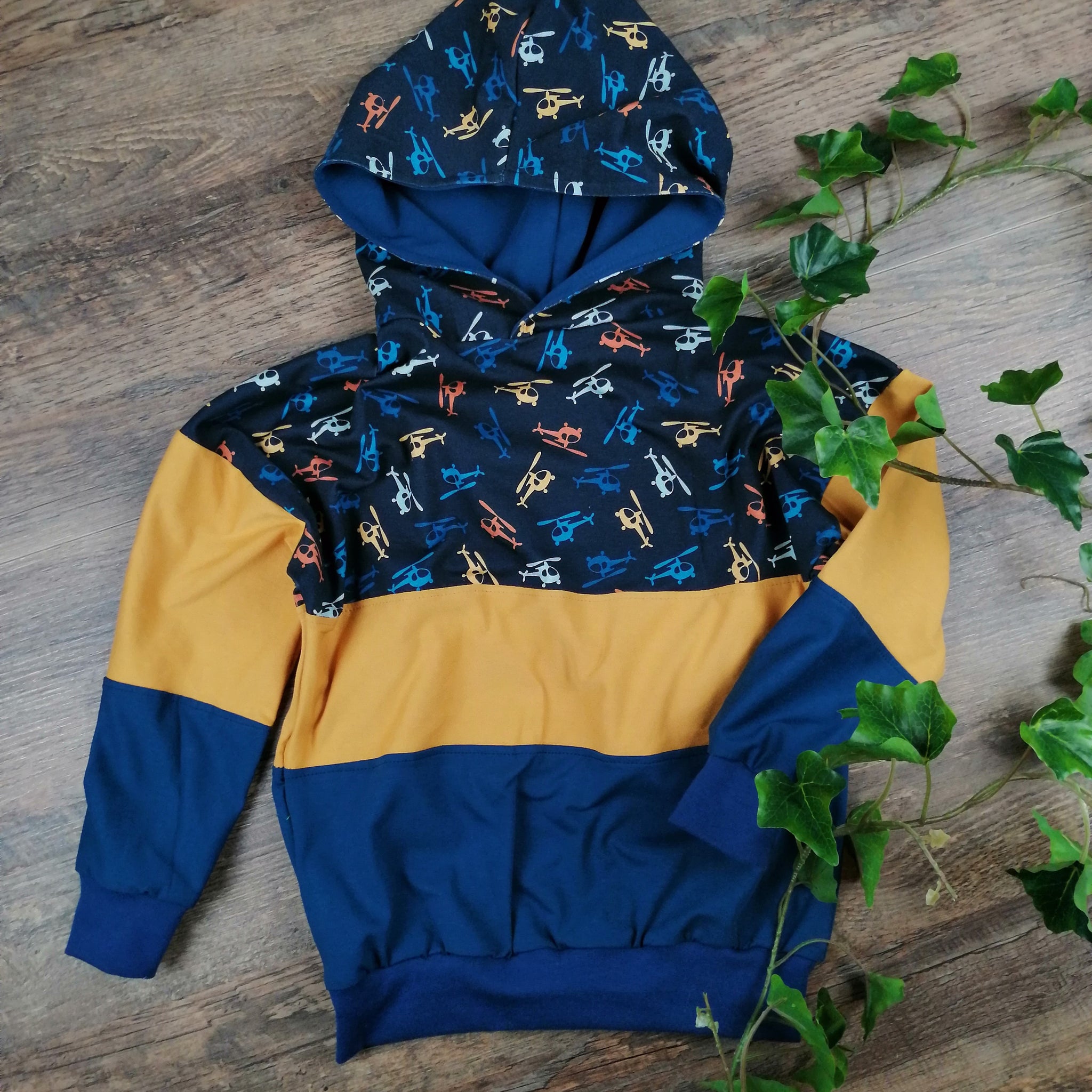 Auf diesem Baumwoll-Jersey sind bunte Hubschrauber zu sehen. Die Hintergrundfarbe ist dunkelblau.