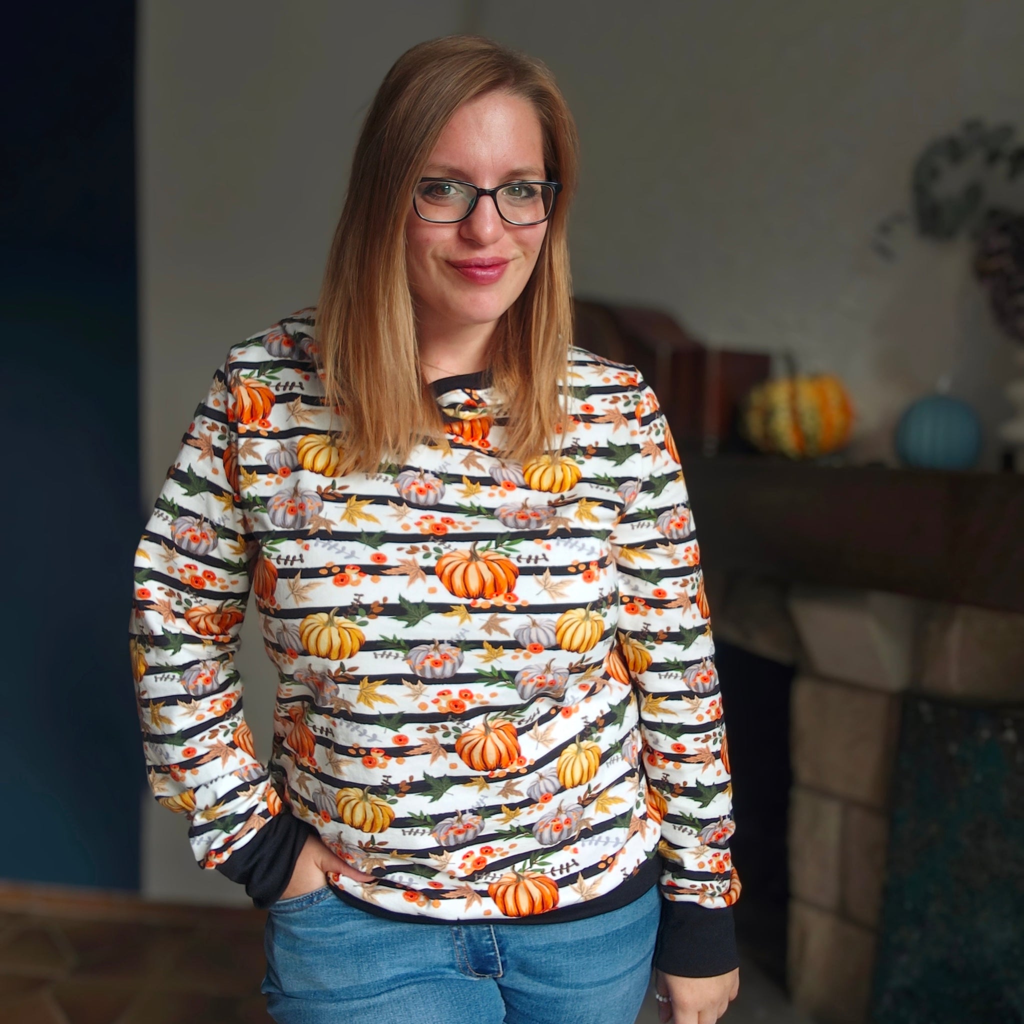 Entdecke unseren bezaubernden Sweat mit bunten Kürbissen und Blättern auf einem zeitlosen Hintergrund aus schwarz-weißen Streifen. Dieser Stoff bietet nicht nur einen charmanten herbstlichen Charme, sondern begeistert auch durch seine vielseitigen Eigenschaften.