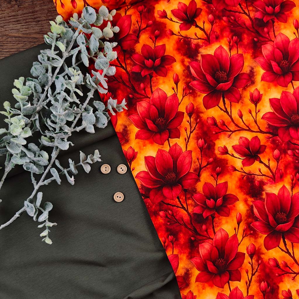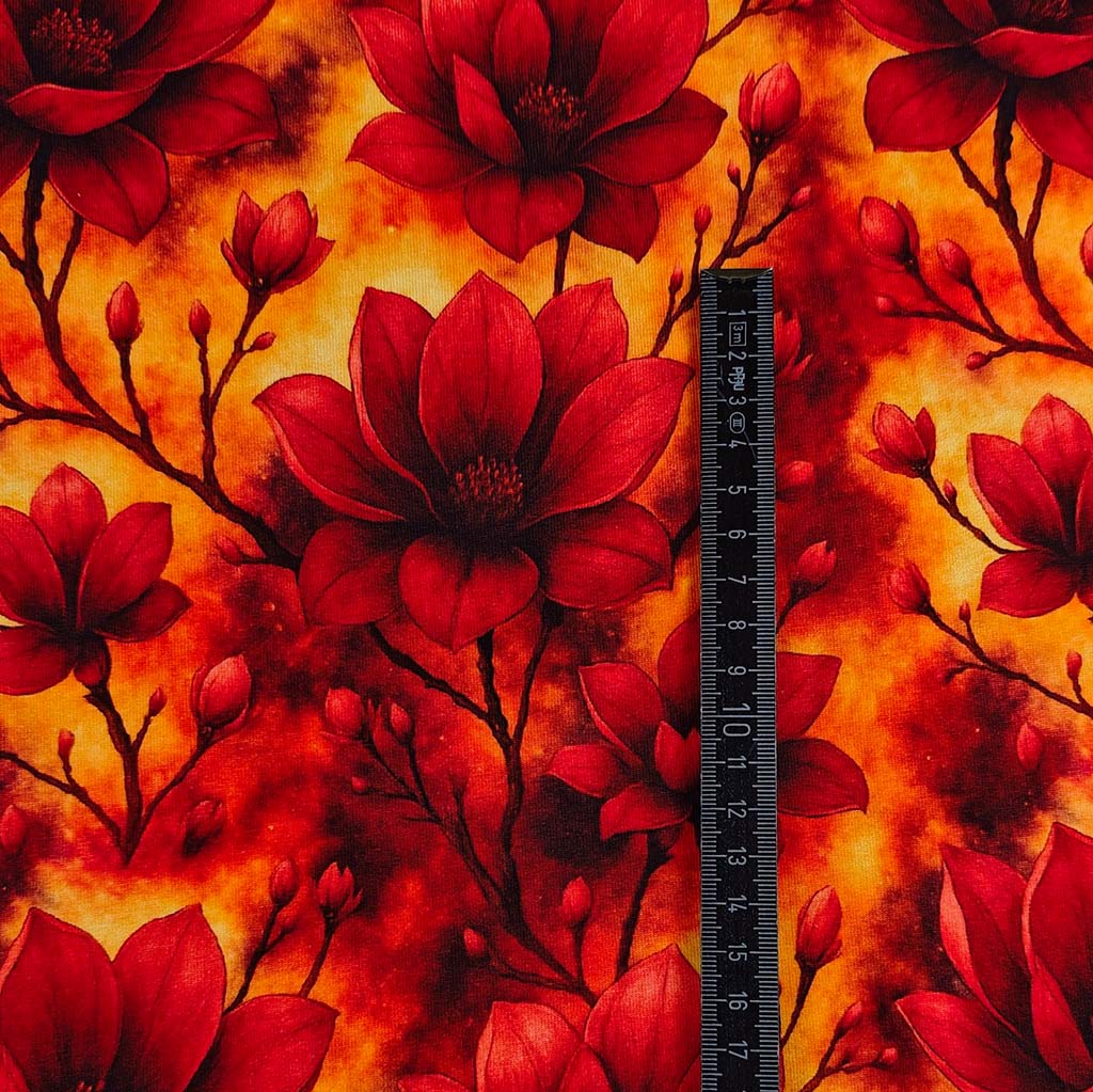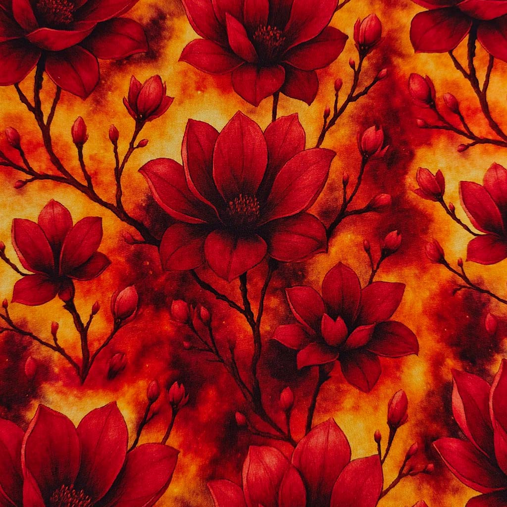 Ein echter Farbenrausch! Der French Terry „Blühende Fantasie“ begeistert mit intensiven Rottönen, lebendigem Gelb und sanften Orangetönen – ein florales Feuerwerk.