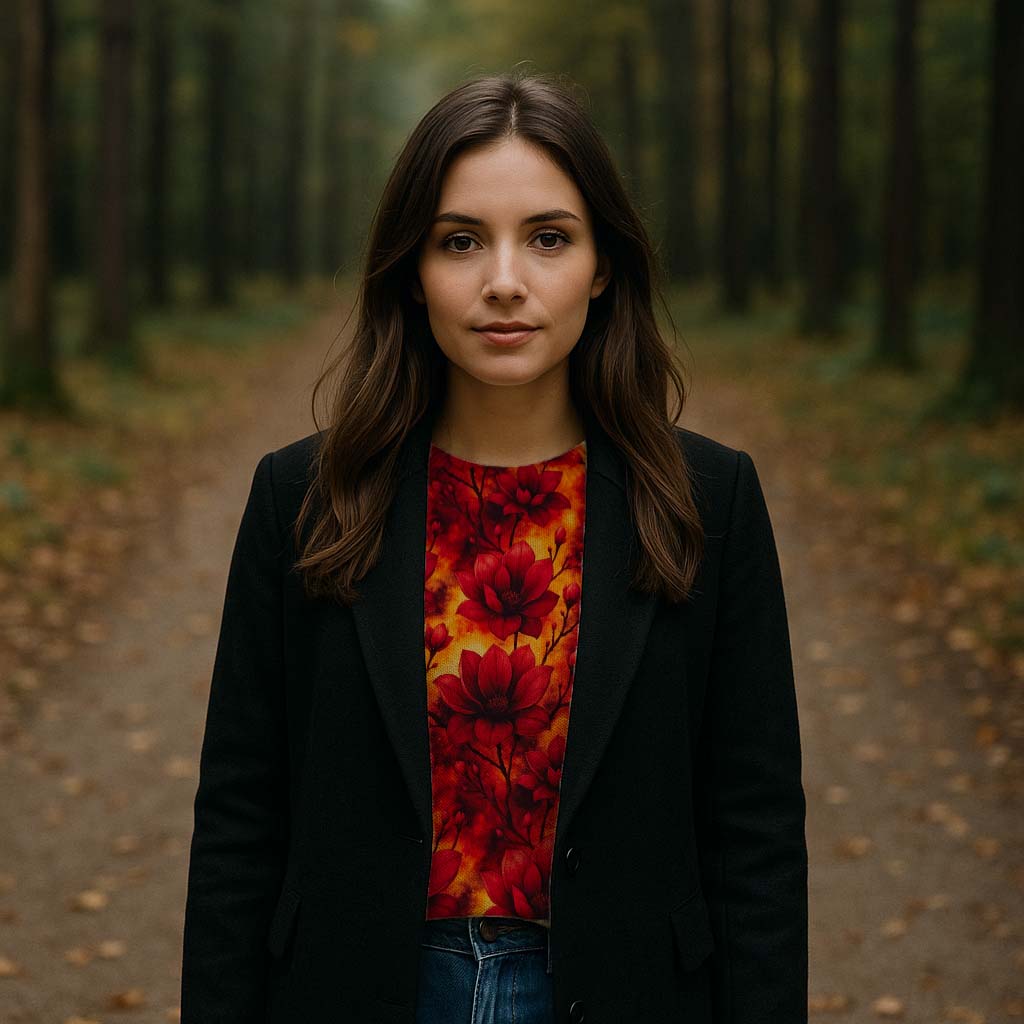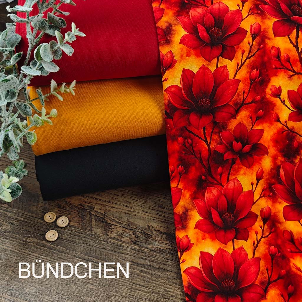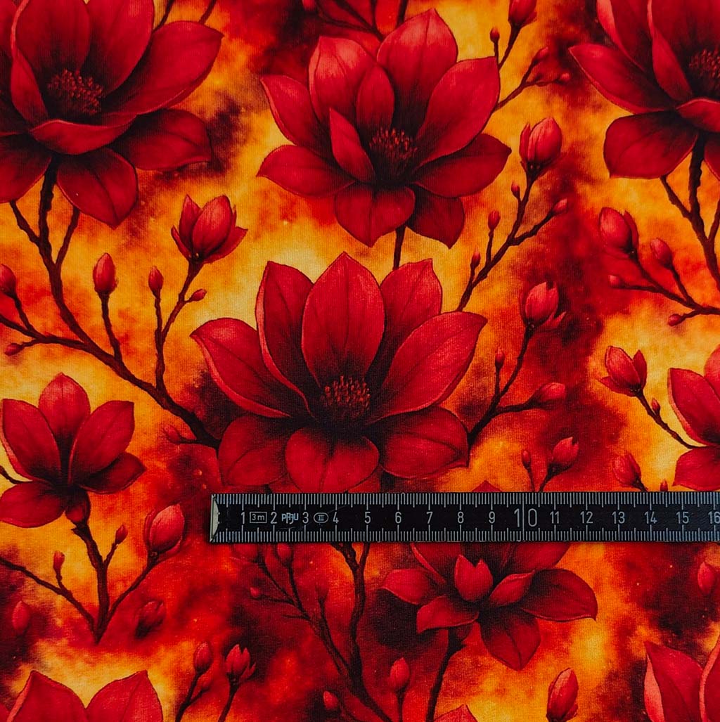 Ein echter Farbenrausch! Der French Terry „Blühende Fantasie“ begeistert mit intensiven Rottönen, lebendigem Gelb und sanften Orangetönen – ein florales Feuerwerk.