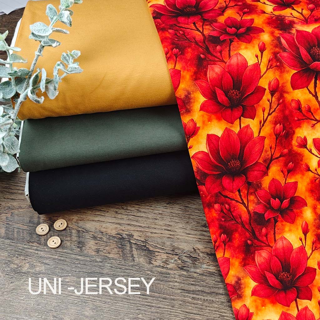 Die passenden Kombistoffe: Jersey Ocker, Khaki und Schwarz