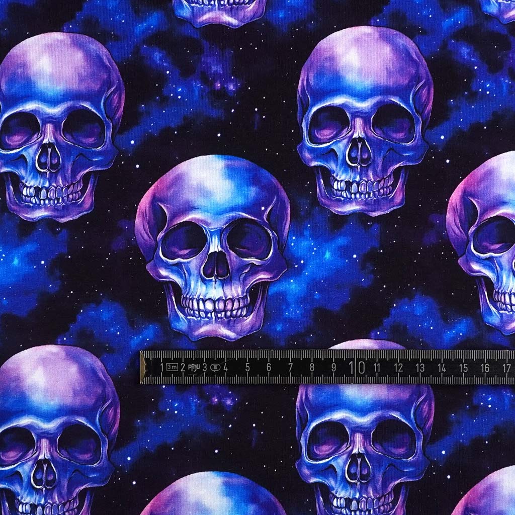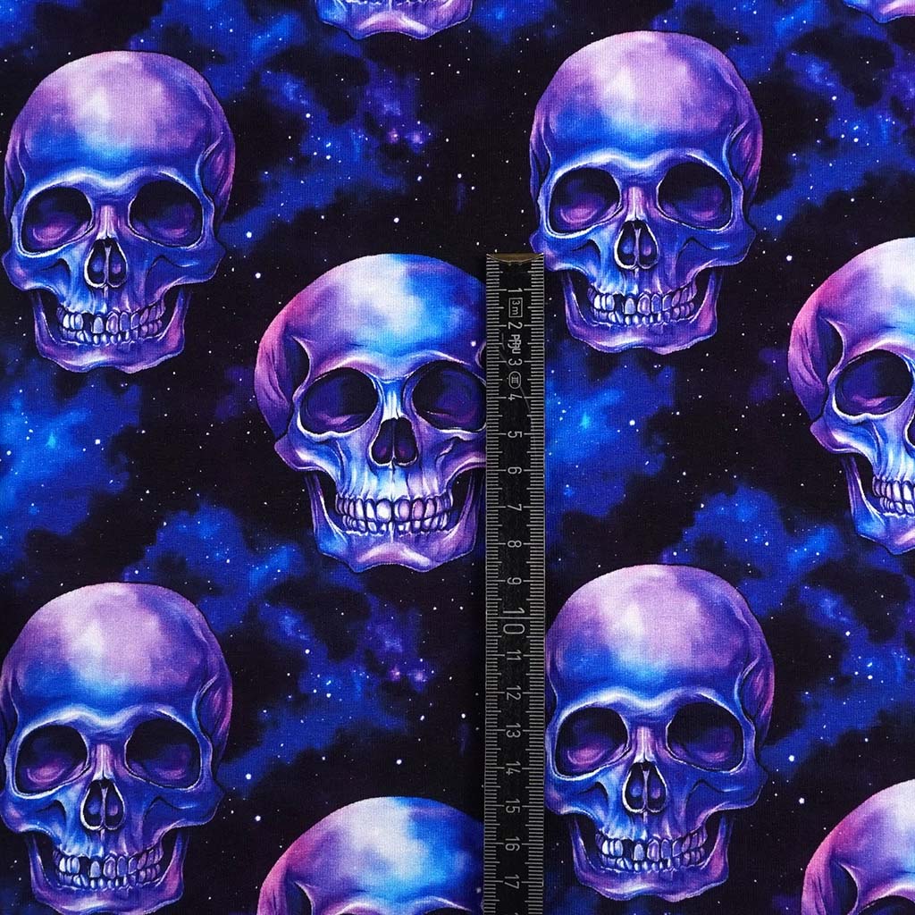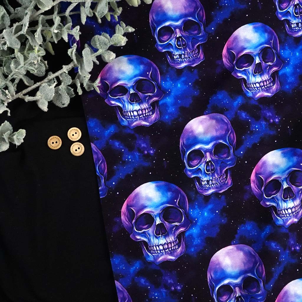 Dieser Stoff ist nichts für schwache Nerven! Dieser French Terry kombiniert mystische Totenköpfe in Neonviolett, Blau und Magenta mit einem tiefdunklen Galaxie-Hintergrund. Ein echter Eyecatcher für alle, die ihren Style rebellisch, außergewöhnlich und kosmisch cool mögen!