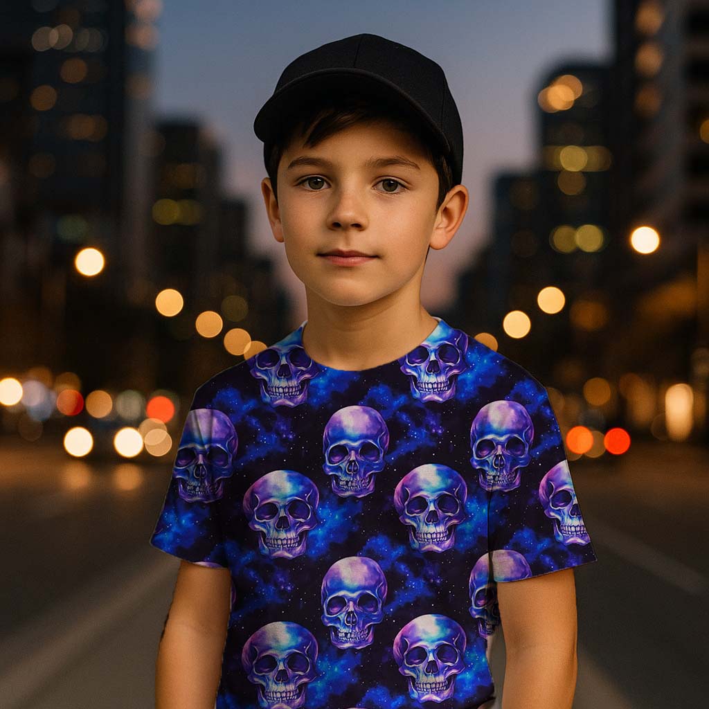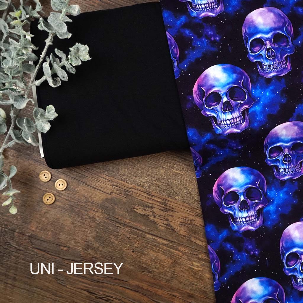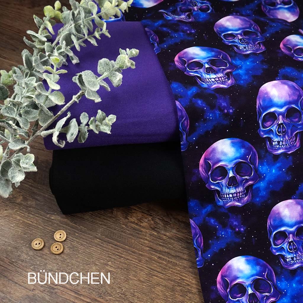 Dieser Stoff ist nichts für schwache Nerven! Dieser French Terry kombiniert mystische Totenköpfe in Neonviolett, Blau und Magenta mit einem tiefdunklen Galaxie-Hintergrund. Ein echter Eyecatcher für alle, die ihren Style rebellisch, außergewöhnlich und kosmisch cool mögen!