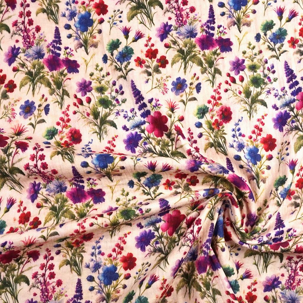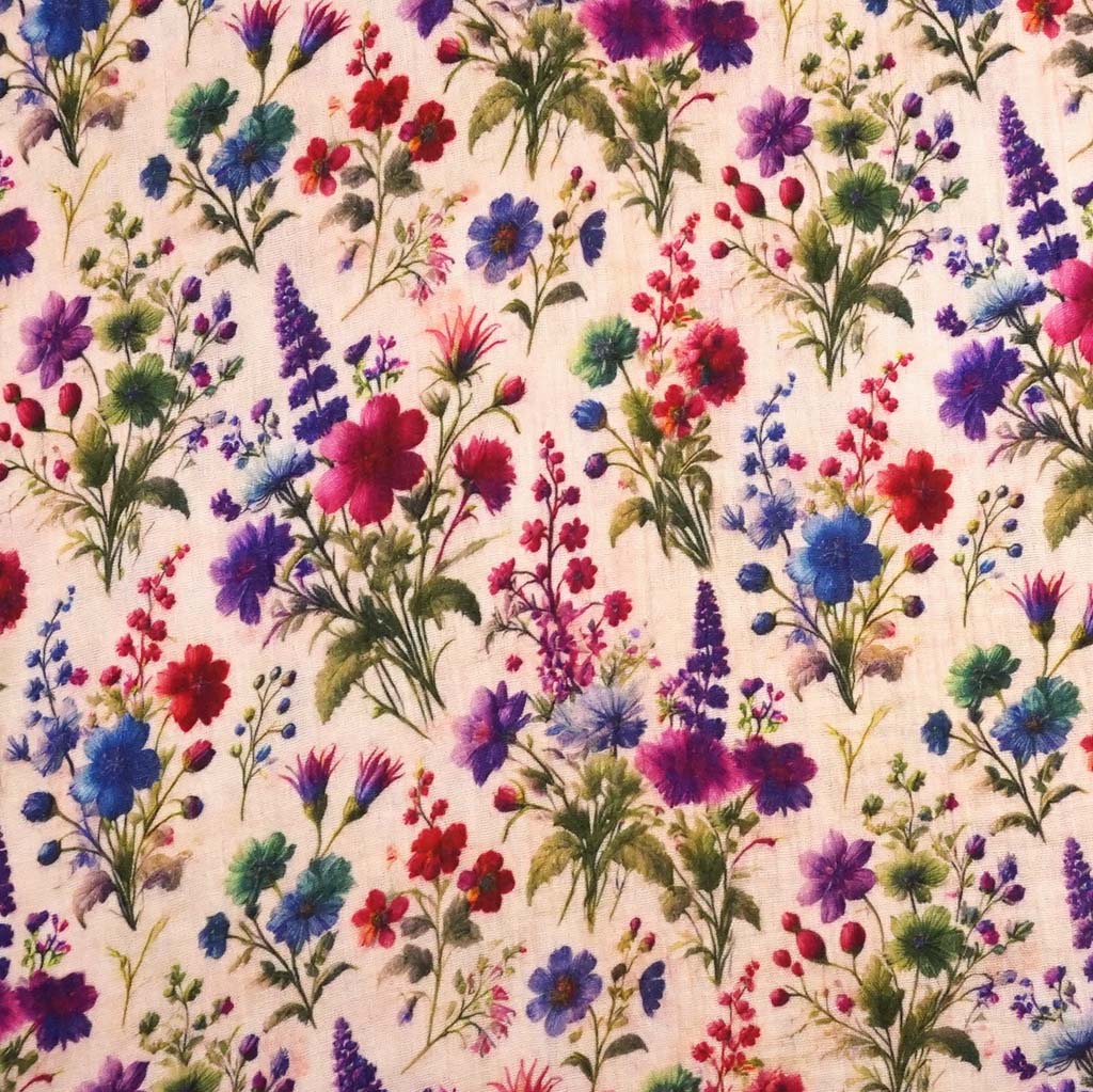 Dieser Musselin aus 100 % Baumwolle verzaubert mit einem fein abgestimmten Blumenmuster in Rot, Violett, Blau und Grün – zart verstreut auf einem cremefarbenen Hintergrund. Die filigranen Blüten wirken wie frisch gepflückt von einer wilden Sommerwiese.