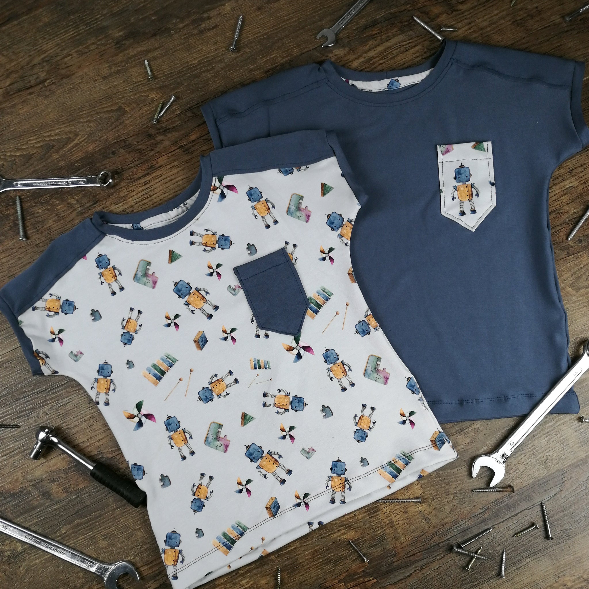 Auf diesem Digitaldruck Baumwoll-Jersey sind große und kleine Roboter zu sehen. Zwischen den Robotern sind Puzzleteile, Windräder sowie Xylophone. Der Hintergrund ist eine Mischung aus einem hellen Grau/Weiß